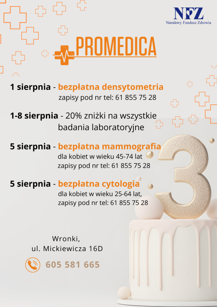 Przychodnia Promedica obchodzi w sierpniu 3 rocznicę powstania. Z tej okazji przygotowano dla mieszkańców Wronek i okolic ważne wydarzenia.